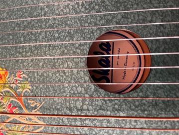 Una chitarra-arpa prodotta in Germania dalla Skala negli anni '60. Il grande strumento musicale in legno è dotato di un totale di 33 corde. Il corpo è stato dipinto di VERDE metallizzato e decorato con un'affascinante illustrazione floreale. La cetra vintage ha tre piccoli piedini sulla base e ha l'etichetta originale del produttore. DIMENSIONI: 44,5 * 29 cm