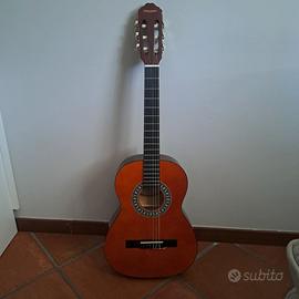 Chitarra 3/4 nuova, usata solo per poche lezioni, montatura corde da mancino ma su richiesta possono essere invertite. Custodia nera per trasporto sulle spalle e 4 plettri.