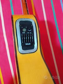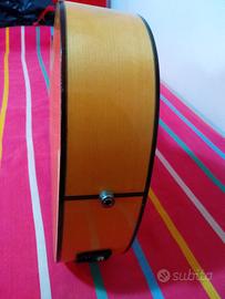 Sonorità eccellente:tavola armonica in abete massello,fasce e fondo in sicomoro, manico in mogano, tastiera in palissandro.