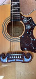 Epiphone EJ-200SCE/N - Corpo e ponte Materiale della tavola: Abete massiccio Materiale corpo: Acero selezionato Tipo di corpo: Jumbo Cutaway Materiale del ponte: Pau Ferro Colore: Natural Gold - Manico e Tastiera Materiale del manico: Acero duro Forma del manico: SlimTaper(TM) D-shape del 1960 Materiale della tastiera: Pau Ferro Intarsio della tastiera: Crown Lunghezza scala: 25,5" / 647,7 mm Larghezza del dado: 1,68" / 42,67 mm - Hardware ed elettronica Colore dell'hardware: Gold Macchine per l'accordatura: Grover® Rotomatic®; rapporto 18:1 Battipenna: Tartaruga con disegno floreale Elettronica: Fishman® Presys(TM) con controllo del volume, interruttori Phase e Contour e accordatore integrato con display a LED. e accordatore incorporato con display a LED.a