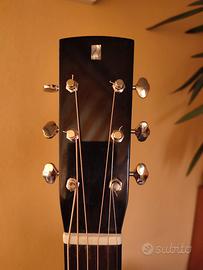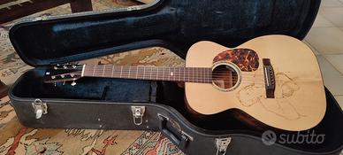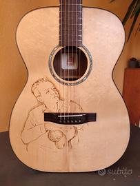 Chitarra di mia produzione modello OM "Pecorari Maurizio " dedicata a Tommy Emmanuel con immagine pirografia , fondo e fasce in Owangkol tavola armonica in abete Fiemme maschiato , manico in Douglas, paletta e pin in ebano con intarsi in madreperla. Ponte e tastiera in palissandro indiano , diapason 64,4 , meccaniche vintage Gotho ,pickguard osco, amplificata LR bags HF . corde Elixir 12/53 con custodia rigida.