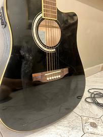 Vendo chitarra acustica eko amplificata. La chitarra è completamente funzionante presenta solo due difetti estetici come da foto. Corde da cambiare. Vendo anche il filo di amplificazione. Prezzo trattabile