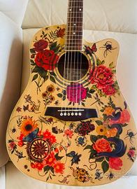 Vendo chitarra acustica Ibanez V70-CE, è stata personalizzata da un mio amico artista con questa grafica floreale che ricorda il mondo dei Tatoo, rendendola un pezzo affascinante ed unico. Lo strumento monta un pre con piezo+mic e cassa transduttiva interna che permette di aggiungere Reverbero, Chorus o Delay anche senza amplificatore.