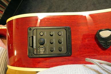 Chitarra acustica elettrificata Gibson Hummingbird (replica cinese!), in perfetto stato. Vendo per carenza di spazio, ma suona benissimo! Non saprei quali siano i legni, ma il manico, sembra in palissandro, o lauro (alloro). Meccaniche, che siano Grover, o meno, sono molto precise e il suono, anche grazie al capotasto e la selletta in Tusq (GraphTech) è caldo, potente, cristallino e con grande sustain! A richiesta, video dimostrativo, sia acustica, che amplificata. Ha una lievissima "disintonazione", ma solo quando si suonano accordi dal XII tasto in poi. Niente che un buon liutaio non possa rettificare e comunque è una chitarra, prevalentemente, da strumming. Migliorata con corde Elixir Ph. Bronze 012, regalo borsa di qualità, portaplettro e chiave per il truss-rod, "customizzata". Purtroppo, NON SPEDISCO, ma se interessa, t'invito da me, per apprezzarne la sorprendente qualità sonora (Roma nord).