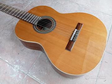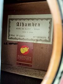 Chitarra Alhambra modello 1P Cedro. Usata in ottime condizioni, unico danneggiamento estetico in foto, si vende completa di custodia morbida imbottita, poggia piede, stand in metallo, leggio e alcuni spartiti.