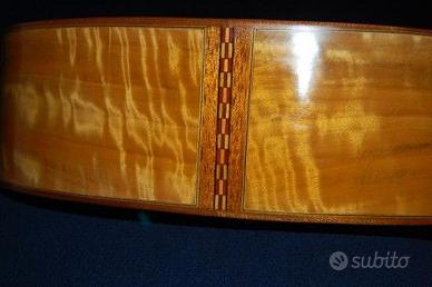 Chitarra arpa di liuteria. Sei corde tastabili e quattro bordoni. Diapason 650. Fasce e fondo in pioppo marezzato, tavola armonica in abete val di Fiemme, manico in cedrela odorata e tastiera in ebano Gabon. Verniciatura gommalacca. Per il blog, da google digitare: liuteriaclassica.jimdofree