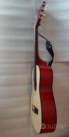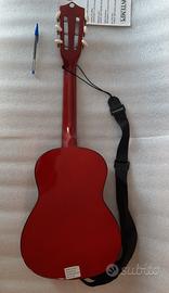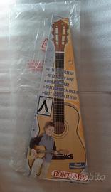 Chitarra in legno Bontempi GSW 75/N 6 corde, 75 cm circa, adatta a bambini da 5 anni in su. Munita di tracolla e libretto con spartiti per esercitazioni. Fornita di busta per conservazione e scatola di cartone originale con maniglia per trasporto. La scatola di cartone non è in buone condizioni in diversi punti. La chitarra è in ottimo stato perché utilizzata pochissimo.