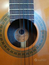 Chitarra classica con 4 corde. Scocca non rovinata. Ponte inferiore rotto. Compresa di custodia in similpelle.