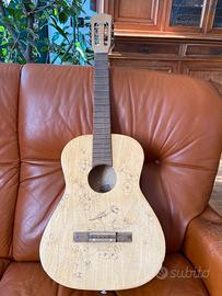 Chitarra classica decorata a mano con pirografia raffigurante uccellino e fiori. Oggetto unico, ideale come elemento decorativo o come chitarra da studio. Design delicato e originale realizzato artigianalmente direttamente sulla tavola armonica. Perfetta per: arredo studio musicale regalo originale home decor