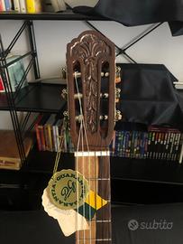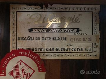 Vendo una splendida chitarra brasiliana Di Giorgio, modello Classic N.28, regolarmente importata da "La nuova melodiosa" e acquistata nuova a Livorno in negozio nei primi mesi del 1972. Nel 1971 le chitarre Di Giorgio hanno cambiato l'etichetta da rettangolare a tonda; la chitarra in vendita ha l'etichetta rettangolare, per cui è presumibilmente stata prodotta nel 1970. La Di Giorgio mi ha detto che l'anno di fabbricazione non è riportato sull'etichetta e il modello è scritto in inglese perché così veniva fatto in quegli anni per le chitarre destinate all'esportazione. La vecchia serie con l'etichetta rettangolare è quella più apprezzata.