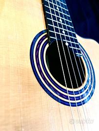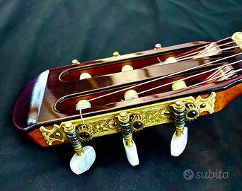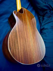 Sotto la tavola armonica struttura a nido d'ape (tavola ultra sottile) , suono forte brillante e ricco di armonici , estremamente comoda da suonare . Liuteria Rinaldo Vacca anno 2013 .
