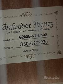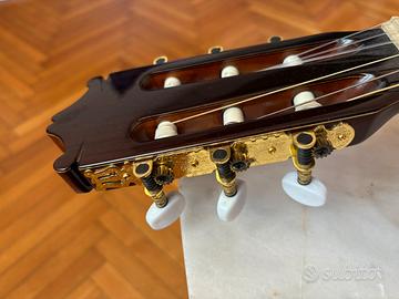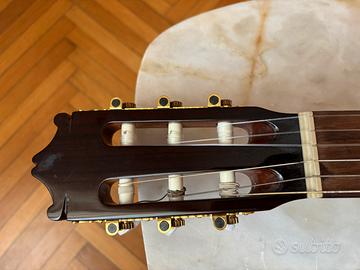 Chitarra classica a 6 corde in abete massello naturale, dotata di accordatore incorporato. Caratteristiche principali: Accordatore incorporato Top: Abete massello Fondo e fasce: Mogano Manico: mogano Tastiera: Palissandro Meccaniche: Dorate Capotasto & sellette: Ibanez Ivorex Usata pochissime volte Vendo compreso di custodia