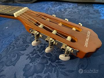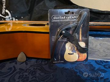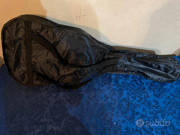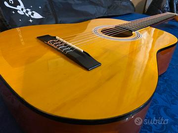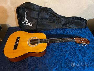 -chitarra classica spagnola 3/4 adatta per principianti e giovani, usata pochissimo dall’acquisto prima di essere rimessa in custodia, come nuova -ponte e tastiera in acero, colore naturale con fasce e fondo bordeaux. -Inclusa custodia protettiva con spallacci e tasca per accessori -inclusi accessori: plettro colore nero e capo