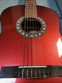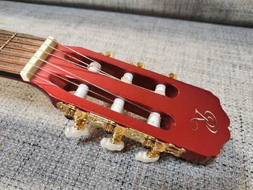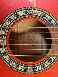 Vendo chitarra classica Roling's CH 396, taglia 39", colore bordeaux. Acquistata nel 2014, usata pochissimo, condizioni perfette, nessun graffio. Top, manico, tastiera e ponticello in acero. Fondo e fasce in tiglio. Meccaniche dorate. Finitura lucida. Corde in nylon (da cambiare). Compresa custodia imbottita.