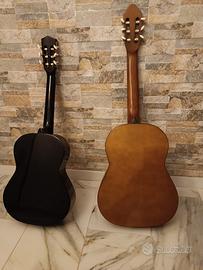 2 chitarre classiche usate. Chitarra piccola misura 7/8 (90cm),nera. Chitarra Grande 3/4 (97cm), marrone. Ideale per 11-14 anni. Custodia nera solo per chitarra grande.