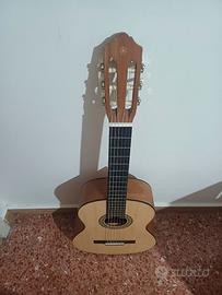 Strumento a corde in nylon, ideale sia per principianti che per chi vuole una chitarra affidabile e di qualità. Tavola armonica in legno chiaro con rosetta decorata, manico comodo e ottima intonazione. Usata pochissime volte, condizioni pari al nuovo, senza graffi né segni di usura.