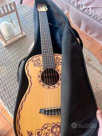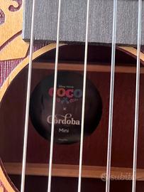 La Cordoba Mini Coco è una chitarra classica da viaggio in scala ridotta (580mm), ispirata al film Disney-Pixar "Coco". Presenta un top in abete, fasce e fondo in mogano con dettagli incisi al laser in stile messicano. È una chitarra acustica a corde in nylon con accordatura standard (E-E), nota per il suo suono caldo e bilanciato nonostante le dimensioni ridotte