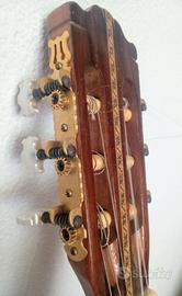 Uno strumento di grande fascino e qualità, perfetto per chi cerca un suono caldo e avvolgente, ma anche un’estetica curata nei minimi dettagli. La chitarra presenta inserzioni in ottone e raffinate lavorazioni artigianali che la rendono unica e distintiva.