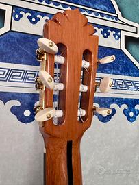 Vendo a prezzo particolarmente interessante, chitarra classica di liuteria Manuel Rodríguez III, strumento costruito con grande cura artigianale e legni masselli selezionati. Suono caldo, ricco e brillante, con ottima profondità ed equilibrio timbrico. Chitarra molto espressiva con action comoda e tastiera scorrevole. Specifiche: • Tavola in cedro e abete • Fondo e fasce in palissandro indiano • Manico in cedro con rinforzo in ebano • Tastiera in ebano • Capotasto e traversina in osso • Scala 650 mm — capotasto 52 mm — 19 tasti Condizioni eccellenti, sempre tenuta con la massima attenzione. 📍 Prova a Roma su appuntamento.
