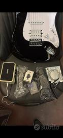 vendo chitarra nuova Donner modello Stratocaster comprensiva di custodia morbida, cinta accordatore digitale, penne personale muta completa di sei corde di ricambio nuova oltre quelle che già ammonta che sono nuove piccola cassa amplificata Bluetooth ricaricabile da 10 W con effetto pulito e distorsione Jack Jack per collegamento e capo tasto come si vede in foto solo gli accessori costano 100 € prezzo richiesto per tutta la chitarra compresa di tutti gli accessori in foto, 135€