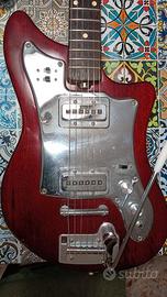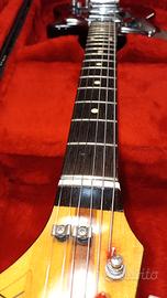 Vendo la mitica EKO X27. Chitarra uscita nelgi anni 60 come modello di prima fascia, diventanto un icona del vintage italiano negli anni successivi. Il suo nome deriva da un modello di aereo che facevano all'epoca. La sua caretteristica principale è sicuramente l'estetica: unica e irrepedibile con il mitico battipenna cromato. Monta 2 single coil che gli danno un bel suono, sopratutto un bel output. In rete spesso ci suonano il blues. Oltre ai switch che attivano e disattivano i pickups ha un altro swith in basso che cambia il suono, quando lo si sposta in alto la chitarra sembra prendere prima di tutto piu volumeed enfatizza i toni bassi, insomma sembra come se suonasse di piu rispetto alla posizione bassa. La chitarra è completa di tutti i suoi componenti(anche la leva) ed il corpo è di un colore piu unico che raro. Di x27 ne ho avuto altre 2 in passato ed al momento ne ho altre 2 ancora ma questa è l'unica di questo colore che ho mai visto. Il liutaio mi ha detto che è il colore è originale, un rosso che la EKO spesso usava sui suoi strumenti. La chitarra funziona perfettamente e non ha bisogno di alcum intervento. La custodia non è originale ma è compresa nel prezzo. Per favore non chiedete nessun tipo di sconti.