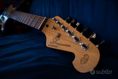 Chitarra elettrica 3/4 double cutaway a 3 single coil, completa di leva del tremolo che collegata al ponte della chitarra, permette di allentare o tendere la tensione delle corde per effetti sonori.