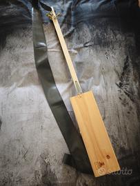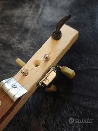 Chitarra Elettrica Cigar Box in Italian Style ricavata da pregiata scatola di vino, a 3 Corde (accordata C-G-C). Strumento Fretless da utilizzare principalmente come slapsteel, ma utilizzabile anche come una normale chitarra ad alto action (con slider). Manico 24 Tasti Fretless - Scala 25,5" Meccaniche Vintage Ponte e Nut Custom Corde attraverso il corpo scala .026 .016 .012 Pickup Cigar Box in legno 3 Corde Volume Tracolla Personalizzata (removibile e utilizzabile con tracolla normale)