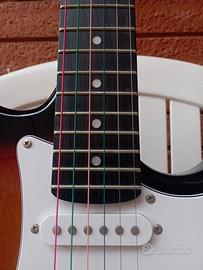 Con corde colorate. Insieme alla chitarra verrano dati molti accessori (plettri, cinture,corde ecc.)