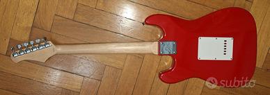 Vendo questa splendida Eko color rosso con corpo in tiglio e manico in acero. È dotata di pickup SSS, 22 tasti su tastiera in palissandro, selettore a 5 vie e controlli separati di tono e volume. Corde nuove.