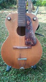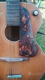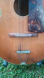 DA RESTAURARE Questa chitarra è unaMogarvintage, prodotta dalla storica azienda milanese Monzino & Garlandini. Storia:Il marchio è noto per aver prodotto strumenti suonati da grandi artisti, inclusa una celebre chitarra utilizzata da Django Reinhardt nel 1950. Periodo:Risale probabilmente alla fine deglianni '50(circa 1958-1959) Configurazione:È una chitarra con corpo "archtop" (tavola bombata) e buca tonda, equipaggiata con elettronica originale dell'epoca, inclusi idue controlli a manopolasulla tavola e un pickup spesso integrato o montato vicino al manico Materiali:Generalmente presentano una tavola in abete e fondo/fasce in acero . La tastiera è in palissandro . Valore Storico:Un modello molto simile fu utilizzato dal celebre chitarristaDjango Reinhardtdurante alcune registrazioni a Roma