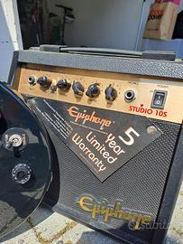 1. Chitarra: Epiphone Les Paul Special Ii È uno dei modelli entry-level più diffusi al mondo. È una chitarra affidabile, con due pickup humbucker che offrono un suono potente, adatto al rock e al blues. • Caratteristiche: Finitura Ebony (nero lucido), hardware cromato e manico bolt-on (avvitato). 2. Amplificatore: Epiphone Studio 10S Un piccolo amplificatore da pratica da 10 Watt, molto basilare, con un cono da 6" o 8". È pensato per studiare in camera senza disturbare troppo • Caratteristiche: Dispone di un tasto per il “ Boost” ( distorsione ) e una uscita per le cuffie. Codice SJO4053514: • SJ: Indica che la chitarra è stata prodotta nella fabbrica Saëjung in Cina. • 04: È l'anno di produzione, ovvero il 2004. • 05: Indica il mese di produzione, in questo caso maggio. • 3514: È il numero progressivo di produzione dello strumento. 3. Accessori La custodia morbida e la tracolla che si vedono nell'immagine aggiungono un piccolo valore logistico al set, facilitando il trasporto .