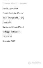 Vendo come nuova Fender Squier Sunburst completa di corde, borsa in ecopelle, accessori vari e amplificatore Fender Champion.