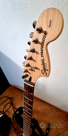 Set completo di tutto l'occorrente per iniziare a suonare la chitarra elettrica. Questa Fender Squier Stratocaster Antique Burst è l'ideale per imparare a suonare. Usata pochissimo è praticamente nuova, non ha un graffio o altri segni di usura. Vendo insieme: - piccolo amplificatore da 10w, ottimo per chi non può fare troppo casino e utilizzabile con cuffie - supporto da terra - mini accordatore elettronico - plettri di varia misura, spessore, durezza - tracolla ufficiale fender - cavo di collegamento chitarra/amplificatore - leggio nero in metallo, robusto e regolabile Prezzo NON trattabile, ritiro a mano.
