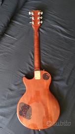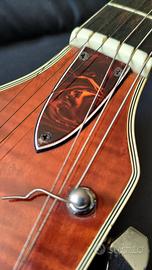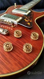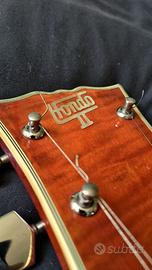 Hondo II H-745N, punta di diamante della produzione Professional/Deluxe Series - Top of the Line, primi anni '80 (rara, unico anno di produzione 1981), Gibson Les Paul replica, una delle chitarre elettriche più iconiche e influenti al mondo. Questo esemplare è un vero gioiello del periodo "post-lawsuit", costruito con legni e finiture di alto livello che nulla hanno a che vedere con le serie economiche del marchio. Corpo solid body in mogano massello, forma single-cutaway, finitura Walnut. Top arcuato in acero fiammato (flame maple), finitura "coda di tigre" con triplo binding avorio. Tastiera in palissandro 22 tasti, Side Dots, inserti in perloide. Manico bolt-on, glossy, Wavy Headstock ("paletta ondulata"). Hardware misto Oro/Cromo con splendida patina vintage. Pickup originali Hondo X-14 High-Output White Bobbins, poli regolabili. Ponte Tune-O-Matic con stopbar tailpiece. Potenziometri "Gold Speed Knobs". Battipenna e cover tartaruga (tortoise shell) a 3 strati. Copri-truss rod a forma di pesce (fish-shaped). Logo "Script" incavato, in vera Madreperla (MOP). Piccoli chip sulla parte inferiore del body e all'angolo della paletta. Sustain infinito, timbro molto scuro e potente, perfetto per classic rock e blues. Perfettamente funzionante e in condizioni estetiche notevoli per avere 45 anni di storia. Corpo: Solid body, arched top, 1/16" "Tiger Tail" flame Maple veneer, Belly carve Manico: Bolt-on Flame Maple neck, Stained Rosewood fretboard, Pearloid trapezoid inlays, Wavy headstock, Tiger Tail Maple headstock veneer, Mother of Pearl Script logo headstock inlay, 22 tasti, scala 24.75" Binding: Triple-bound headstock su body, Celluloid bound fretboard Elettronica: 2 covered humbuckers, 3-way switch, 2 Vol, 2 Tone Hardware: Gold hardware, chiavette singole cromate, Flat-mounted pickguard, plastiche Tortoise shell, 3-ply pickguard, Control cavity covers, Fish shaped truss rod cover, Gold speed knobs, Tune-O-Matic bridge con stopbar tailpiece. Peso: ca. 4.5 kg