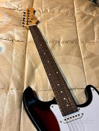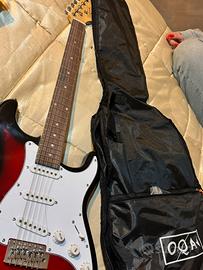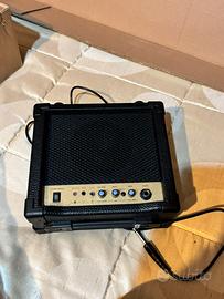 completo con custodia, mini amplificatore, corde di ricambio (una rotta ma ripareremo prima di spedirla), e tracolla.
