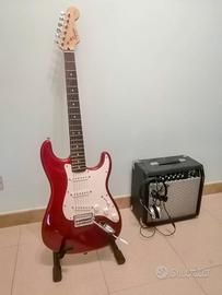 Vendo bellissima Stratocaster Squier Fender Affinity Red Metallic come nuova,con custodia Fender, tracolla Fender mai usata, supporto da terra pieghevole, accordatore amplificatore Fender