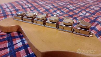 La chitarra è stata recentemente settata da un liutaio ed è suonabilissima. Tiene perfettamente l'accordatura anche dopo aver usato tanto il tremolo grazie al blocco del ponte in alluminio e alle meccaniche autobloccanti. Non è mai stata portata fuori casa. Sulla paletta presenta una decal custom (ovviamente non è una vera Fender) facilmente rimovibile con una spugnetta abrasiva nel caso si voglia.