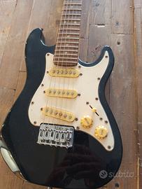 chitarra elettrica per bambini Harley Benton in ottime condizioni, perfettamente funzionante. Chitarra tipo Stratocaster con tre pickup, un volume, un tono e switch a 5 posizioni. colore nero battipenna bianco.