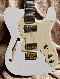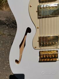 Questa chitarra semi-hollow unisce classe e versatilità : corpo bianco con buca a F, n.2 humbucker dorati e dettagli in oro – una combinazione che cattura lo sguardo e conquista l'orecchio.