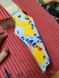 Come da titolo, vendo chitarra elettrica economica ma che suona molto bene. E' stata smontata e riverniciata completamente in stile swirl, vani completamente riverniciati con vernice conduttiva, pickup stile sh8, pot del tono escluso, Paletta verniciata swirl, body in tiglio, manico in 2 pezzi di acero. Radius tastiera 16" larghezza capotasto 42 mm, spessore manico al 1° tasto: 21 mm, 24 tasti. E' una chitarra molto bella come potete vedere ed è pronta per essere suonata senza passare dal liutaio. Qualsiasi prova ma a casa mia. Prezzo non trattabile. Come potete vedere dalle foto, è stato verniciato in stile swirl, anche il coperchio del vano potenziometri e le relative viti. Vendo a malincuore per esubero.