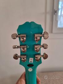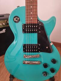 vendo chitarra elettrica Epiphone modello Les Poul studio color turchese in condizioni pari al nuovo. Nessun graffio e usata rarissime volte. da vetrina. Amplificatore marshall con scatola originale da 15 watt e regalo treppiede di sostegno chitarra. no perditempo e prezzo leggermente trattabile.
