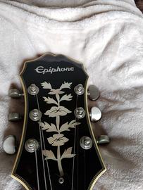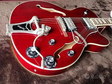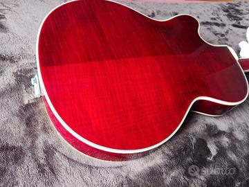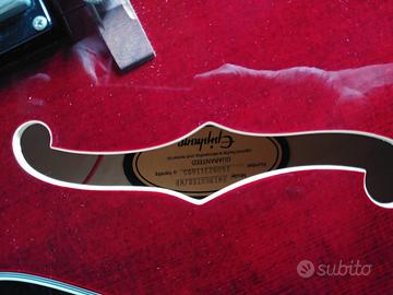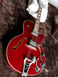 Comprata solo per estetica e mai usata, tenuta appesa per arredo in perfette condizioni con ancora le corde originali, chitarra semiacustica elettrificata Epiphone Emperor Swingster colorazione red wine abete fiammato bellissima ! ...è caratterizzata da un corpo da chitarra archtop e da un'elettronica aggiornata: i controlli push/pull permettono di commutare da serie a parallelo in un semplice gesto ottenendo un timbro più chiaro e brillante. La scala è più corta rispetto ad una normale archtop (24-1/2") per una maggiore facilità d'esecuzione. Le specifiche tecniche distintive sono una tavola in abete fiammato , fondo e fasce in betulla e acero laminati, ponte Bigsby B60 e meccaniche Grover Imperial.