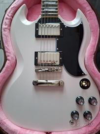 Vendo Epiphone Les Paul SG 1961 aged white inspired by Gibson Custom Shop. Corpo in 2 pezzi di mogano e manico in un unico pezzo di mogano. Pickup Gibson Burstbucker 2/3, potenziometri CTS e condensatori Mallory. Ottimo stato, come da foto, tenuta benissimo con lievi segni di utilizzo. Accompagnata da custodia rigida Epiphone originale. Non spedisco, solo consegna a mano.