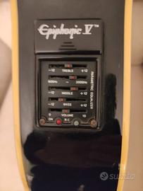 La EPIPHONE ORVILLE GIBSON EO-2 Š una chitarra folk elettrificata di colore nero lucido. E' la replica, siglata Epiphone e perfettamente realizzata, della chitarra costruita nel 1894 da Orville Gibson. Chitarra di bellezza unica, perfettamente realizzata con ottimi materiali, dal suono bello e definito. - Sistema attivo di preamplificazione con equalizzazione paramctrica/Pre-amp Epiphonic V -pick up piezo - tavola in abete selezionato unico - fondo e fasce in mogano - manico in mogano - tastiera e ponte palissandro - intarsi a punto -bordatura corpo, manico e paletta - scala 635 - meccaniche dorate Die-Cast - corpo sottile con spalla mancante di tipo veneziano - inserto farfalla sulla tavola - paletta di forma originale Orville Gibson del 1894 con stella e luna crescente. Pochi rimasti in giro