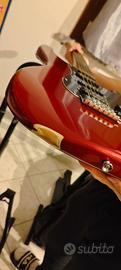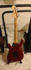 Chitarra Fender Squier Stratocaster 2 Single Coil e 1 Humbucker (Buone condizioni). Più custodia (molto usurata). Colore Rosso Cherry metallizzato. Piccola botta sverniciata e riparata con levigatura e laccatura lucida che non compromette utilizzato.