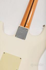 Fender Stratocaster Custom Shop Vintage (Jimmy Hendix). Ci ho messo anni per realizzarla. Tutti i pezzi sono del 1968 originali ufficiali Fender Custom Shop. Sono riuscito ad ordinare il legno dall’America (quindi legno americano, non cinese), ho fatto sagomare il body da un liutaio a Roma e fatta assemblare da un liutaio a Malo (Vicenza). Le decal me li sono fatte arrivare da San Francisco. E’ perfetta, senza un graffio, ha ancora la pellicola sul battipenna (seconda e terza foto). Usata pochissime volte e tenuta maniacalmente.