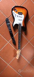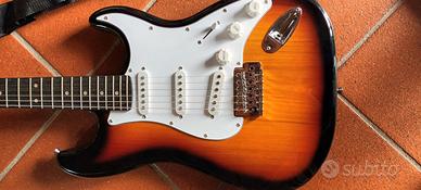 chitarra elettrica con amplificatore, poggia piedi e appendi chitarra da muro e custodia della chitarra quasi mai usata