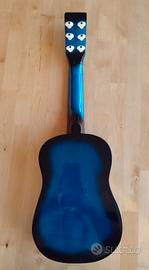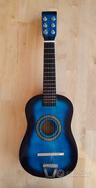 Chitarra giocattolo per bambini in legno, dal design accattivante con finitura blu sfumata. Misura 60 cm di lunghezza per 20 cm di larghezza, ideale per i più piccoli che vogliono avvicinarsi alla musica in modo divertente. Leggera e maneggevole, con 6 corde e dettagli decorativi, perfetta come regalo educativo o per gioco creativo.