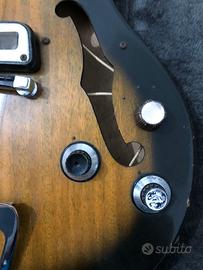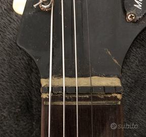 Chitarra elettrica originale anni 60 con custodia in pelle d'epoca. Funzionante ma con difetti. I contatti dei potenziometri e dei pickup hanno bisogno di manutenzione/revisione. Difetti estetici come descritto nelle foto. Ponte alto ricostruito. Pirulo del Mi alto leggermente storto ma funzionate. Segni di ammaccature sulla paletta e sulla cassa.