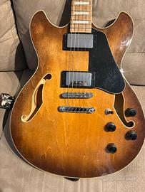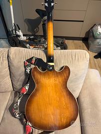 Vendo chitarra semiacustica stile Gibson ES-335, colore sunburst vintage, con corpo in acero e finitura lucida.